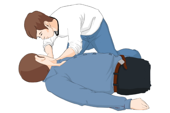 ? ? ? ?如患者無(wú)呼吸,立即進(jìn)行口對(duì)口人工呼吸。摸頸動(dòng)脈,如果能感覺(jué)到搏動(dòng),那么僅作人工呼吸即可。為防止細(xì)菌感染,采用接口套,用酒精消毒。施救者一手捏住患者鼻子,大口吸氣,屏住,迅速俯身,用嘴包住患者的嘴,快速將氣體吹入。與此同時(shí),施救者的眼睛需觀察患者的胸廓是否因氣體的灌入而擴(kuò)張,氣吹完后,松開(kāi)捏著鼻子的手,讓氣體呼出,這樣就是完成了一次呼吸過(guò)程。每分鐘平均完成12次人工呼吸。